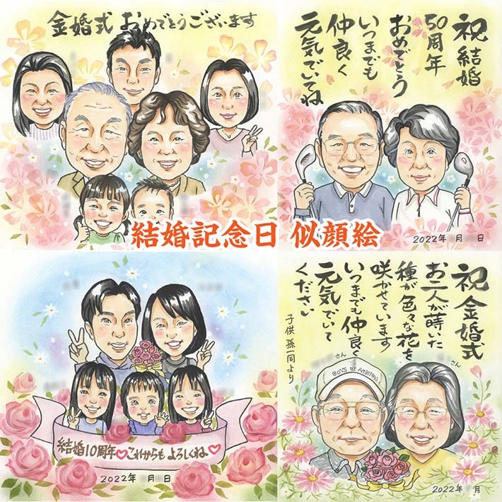 結婚50周年のお祝いを特別なプレゼントで彩る。両親や祖父母への感動的な似顔絵ギフト。記念日や誕生日のお祝いに最適で、大人数でも対応...