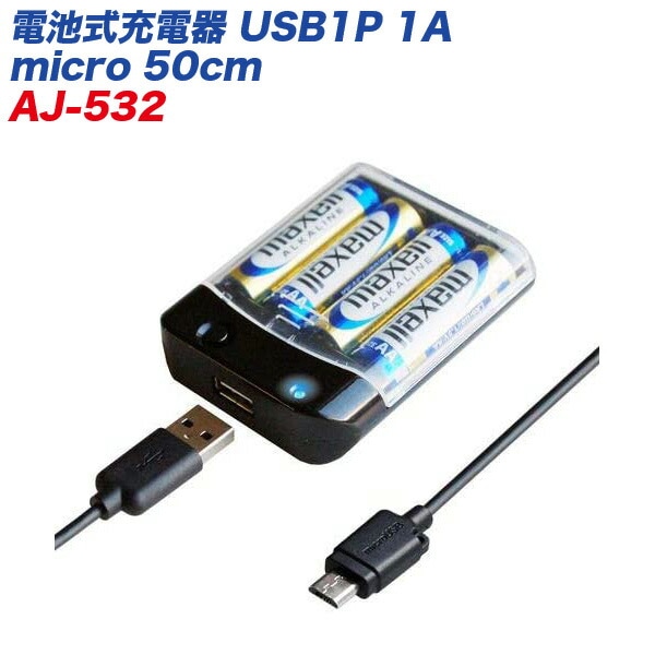 カシムラ 電池式充電器 USB1P 1A micro 50cm スマホ/ケータイ 通電確認LED付 単三乾電池 AJ-532