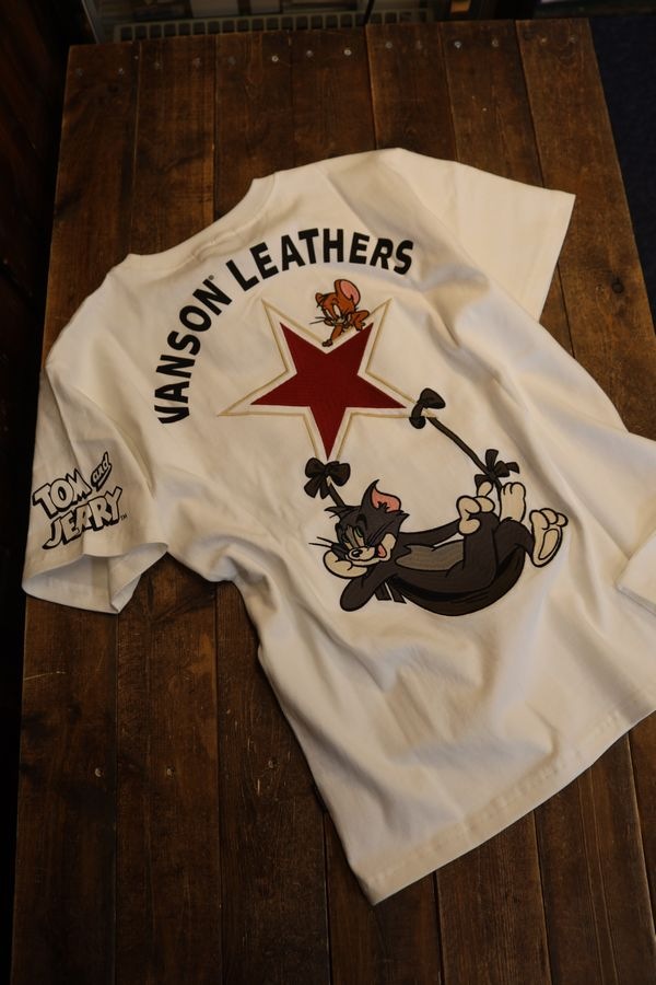 VANSON×Tom and Jerry トムとジェリーコラボ TJV-2429 天竺半袖Tee バイク刺繍 オフホワイト