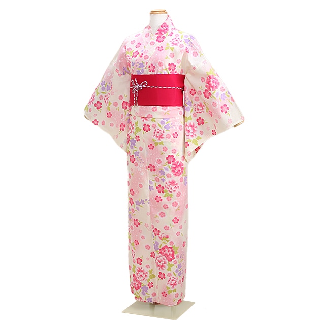 【浴衣 レンタル】レディース 3点セット☆浴衣・帯・下駄☆nt-y043 白地/芍薬 モダン花柄