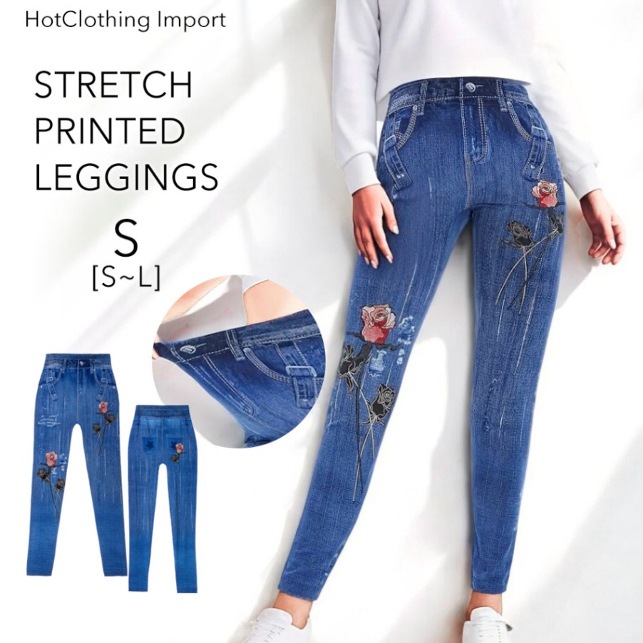[HotClothing Import] ローズプリント 花柄 デニムプリント レギンス スーパーストレッチ スキニーパンツ ...