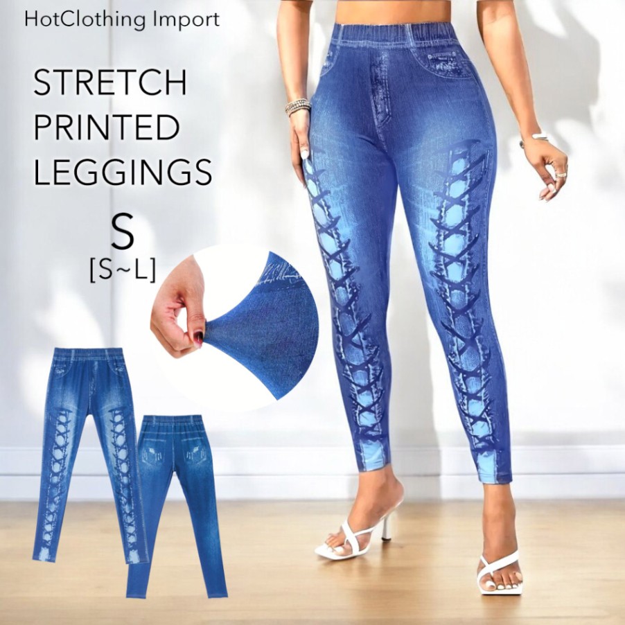 [HotClothing Import] イミテーション デニムプリント レギンス スーパーストレッチ スキニーパンツ ジェギンス...