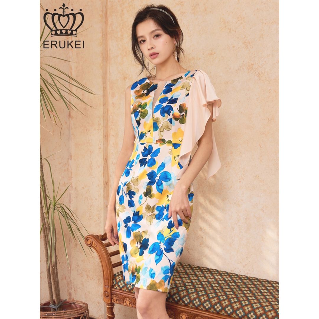 GINZA COUTURE \"エレガントフラワープリント・ケープスリーブ・Aラインミディアムドレス\" ワンピース [ERUK...