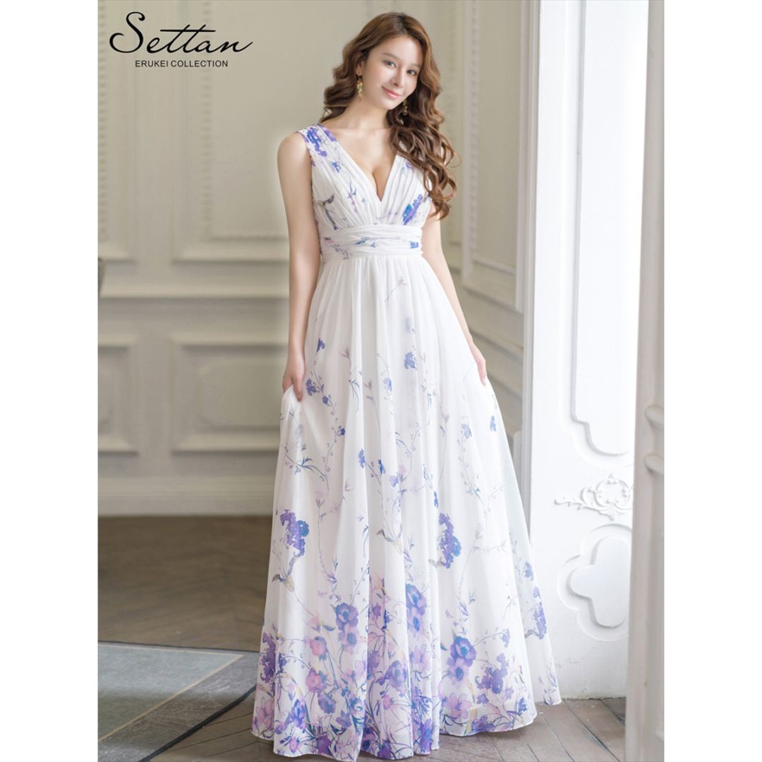 [SETTAN] シフォン 花柄 フラワープリント Aライン Vネック ノースリーブ ロングドレス ホワイト ベージュ ブルー パ...