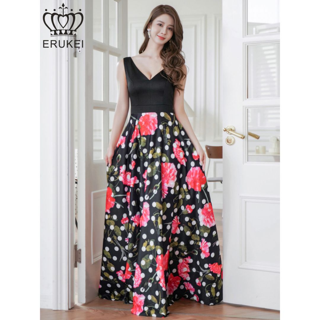 [ERUKEI] 2color 花柄プリント ハイウエスト Vネック ノースリーブ マキシ ロングドレス Aライン ワンピース イ...