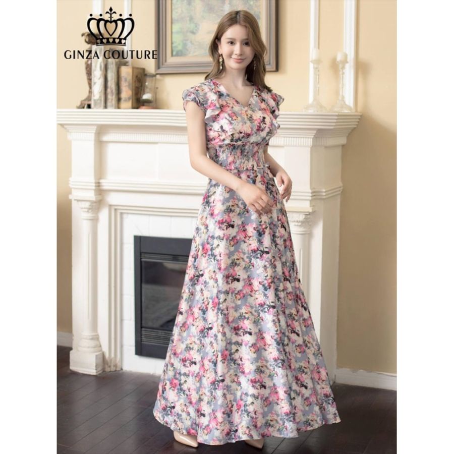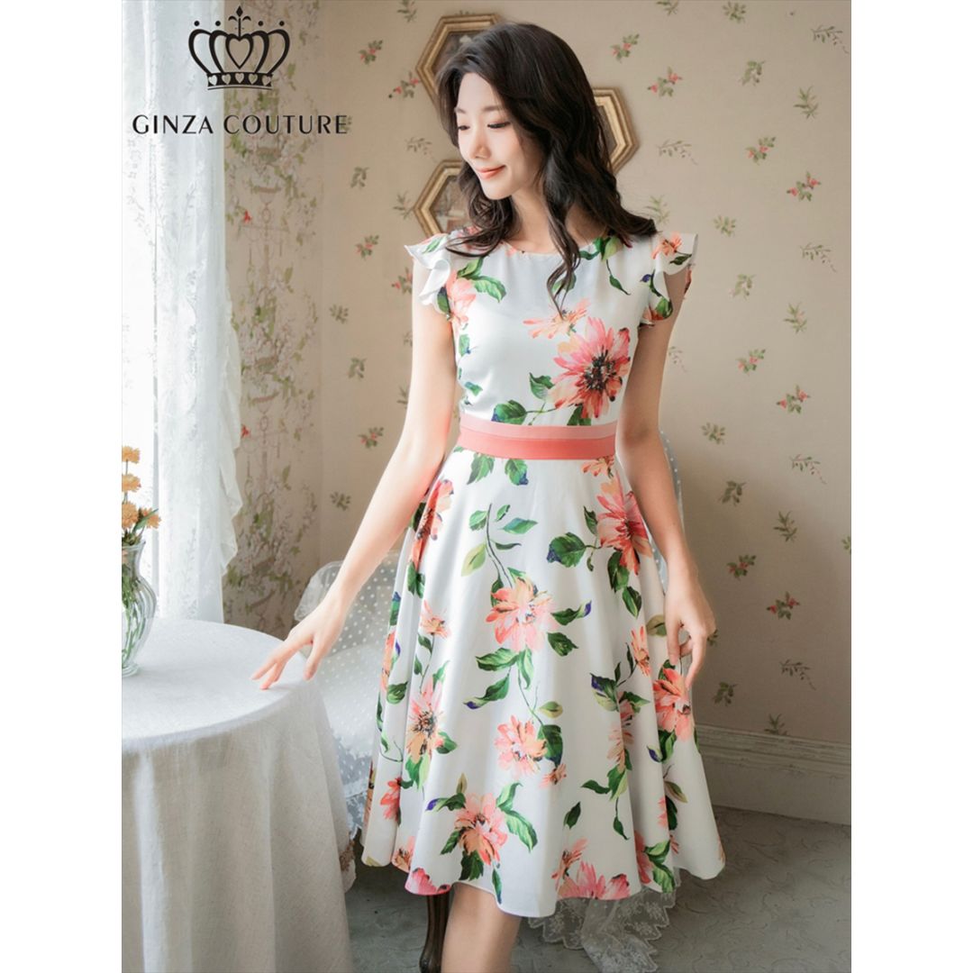[GINZA COUTURE] 2color 花柄 フラワープリント フリルスリーブ・Aライン フレアー ミディアムドレス ワンピ...