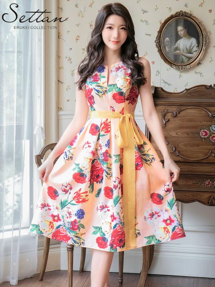 [SETTAN] フラワープリント 花柄 ノースリーブ ハイウエスト Aライン ミディアムドレス ワンピース エレガント モダン ...
