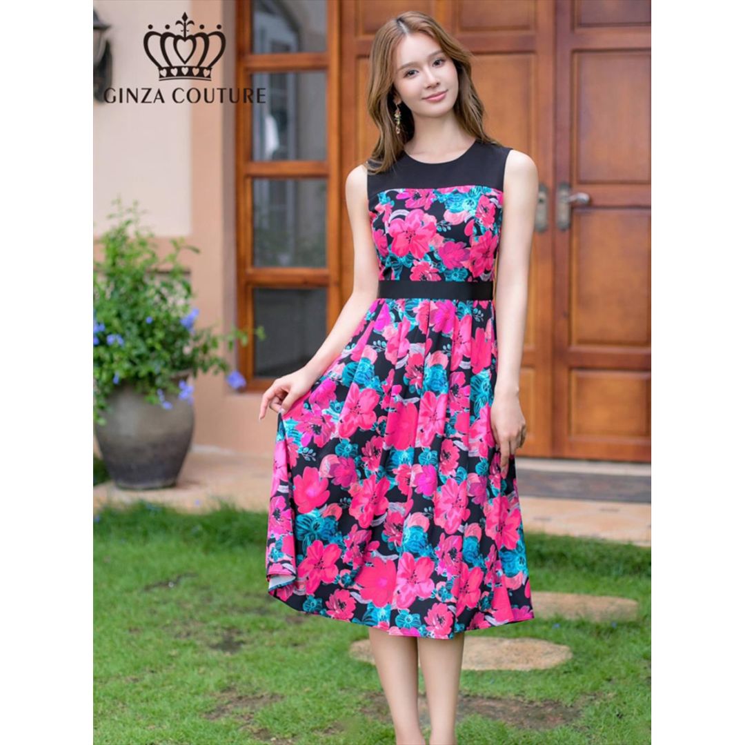[GINZA COUTURE] 2color 花柄 プリント ノースリーブ ハイウエスト ウエスト切り替え Aライン ミディアムド...