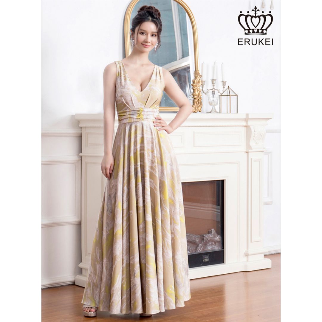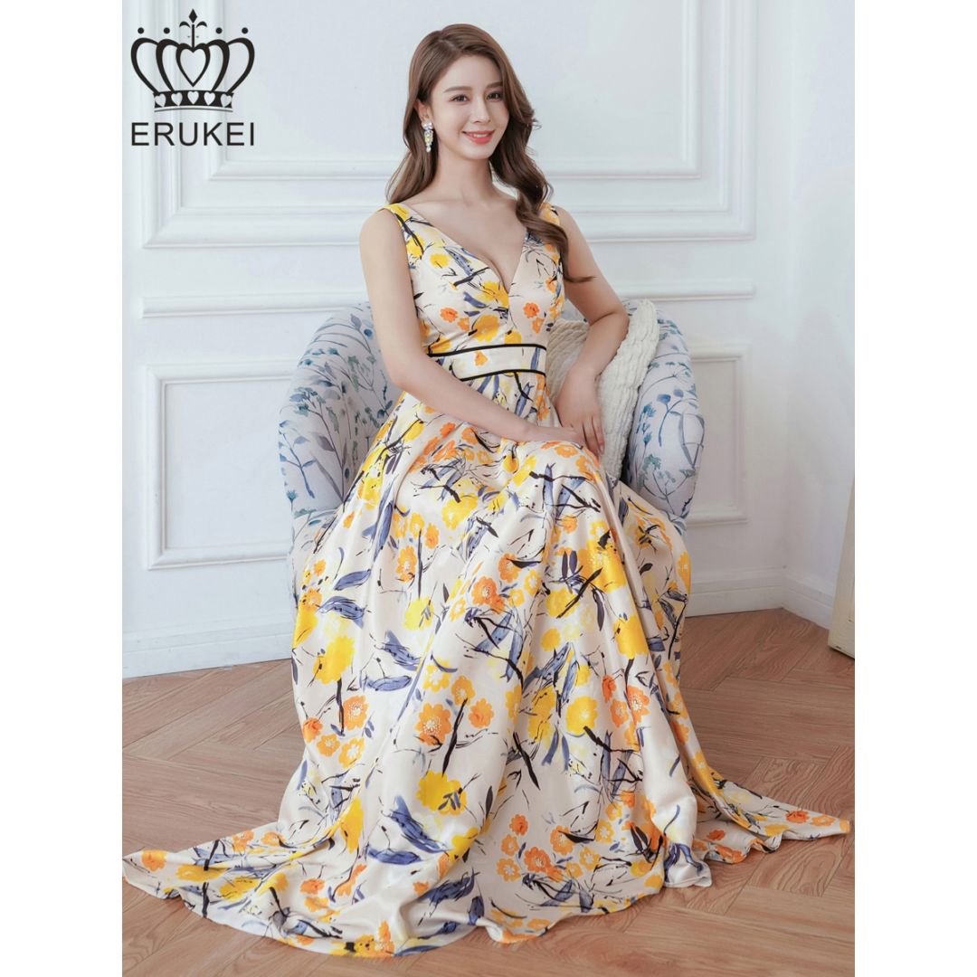 [ERUKEI] プリント ノースリーブ Vネック Aライン ロングドレス イエロー エレガント モダン シック キュート フォー...