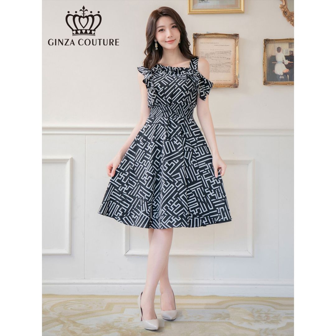 [GINZA COUTURE] プリント Aライン 肩フリル フレア 膝丈 ワンピース ブラック エレガント モダン シック キュ...