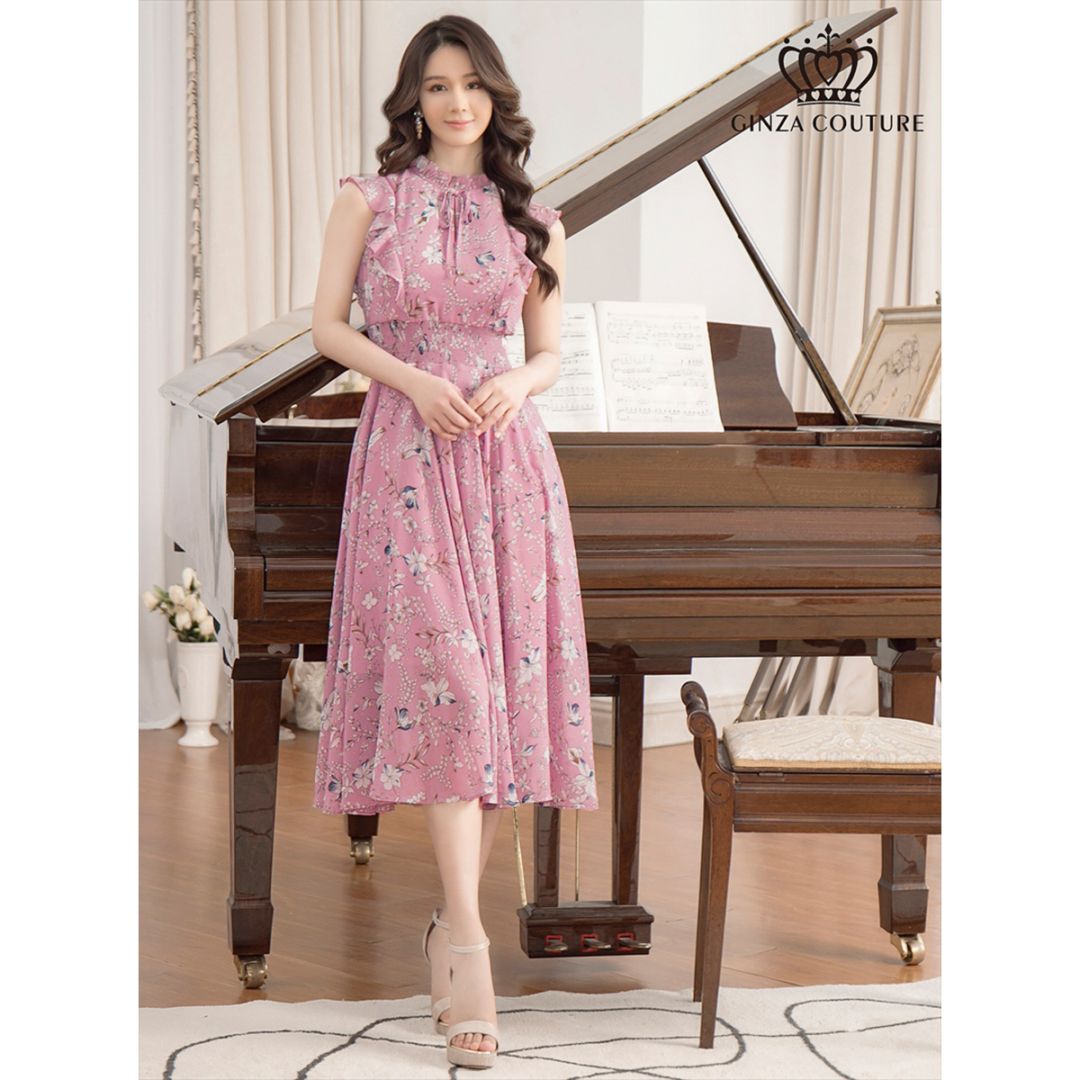 [GINZA COUTURE] フラワープリント Aライン プチハイネック ミディアムドレス ワンピース ピンク エレガント モダ...