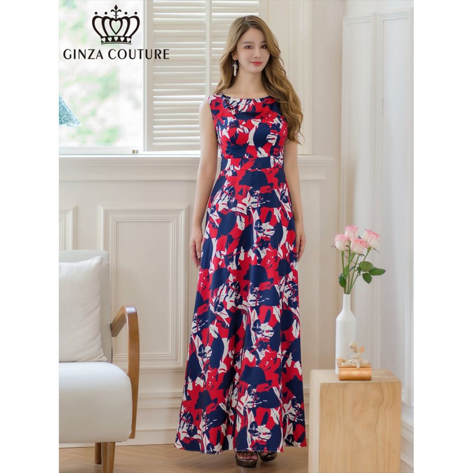 [GINZA COUTURE] ペイントプリント トリコロール ノースリーブ Aライン ロングドレス レッド×ネイビー エレガント...