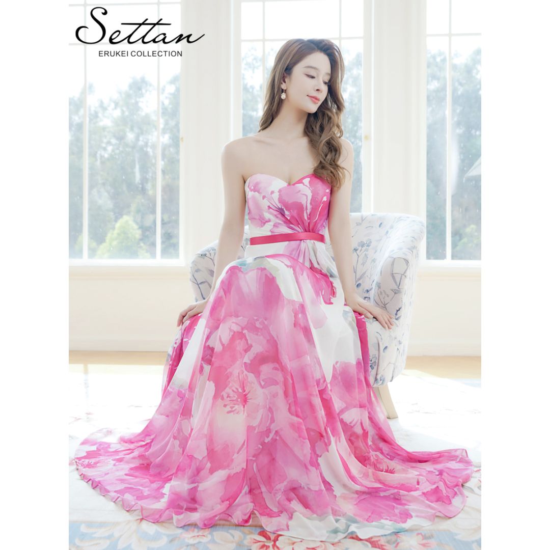 [SETTAN] 2color ベアトップ スピンドル シフォン 花柄 プリント Aライン ロングドレス ホワイト×ピンク ホワイ...