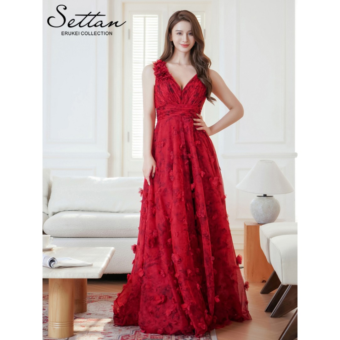 [SETTAN] 立体フラワー プリント チュールレース Vネック ノースリーブ ロングドレス ワインレッド 赤 真紅 薔薇 エレ...
