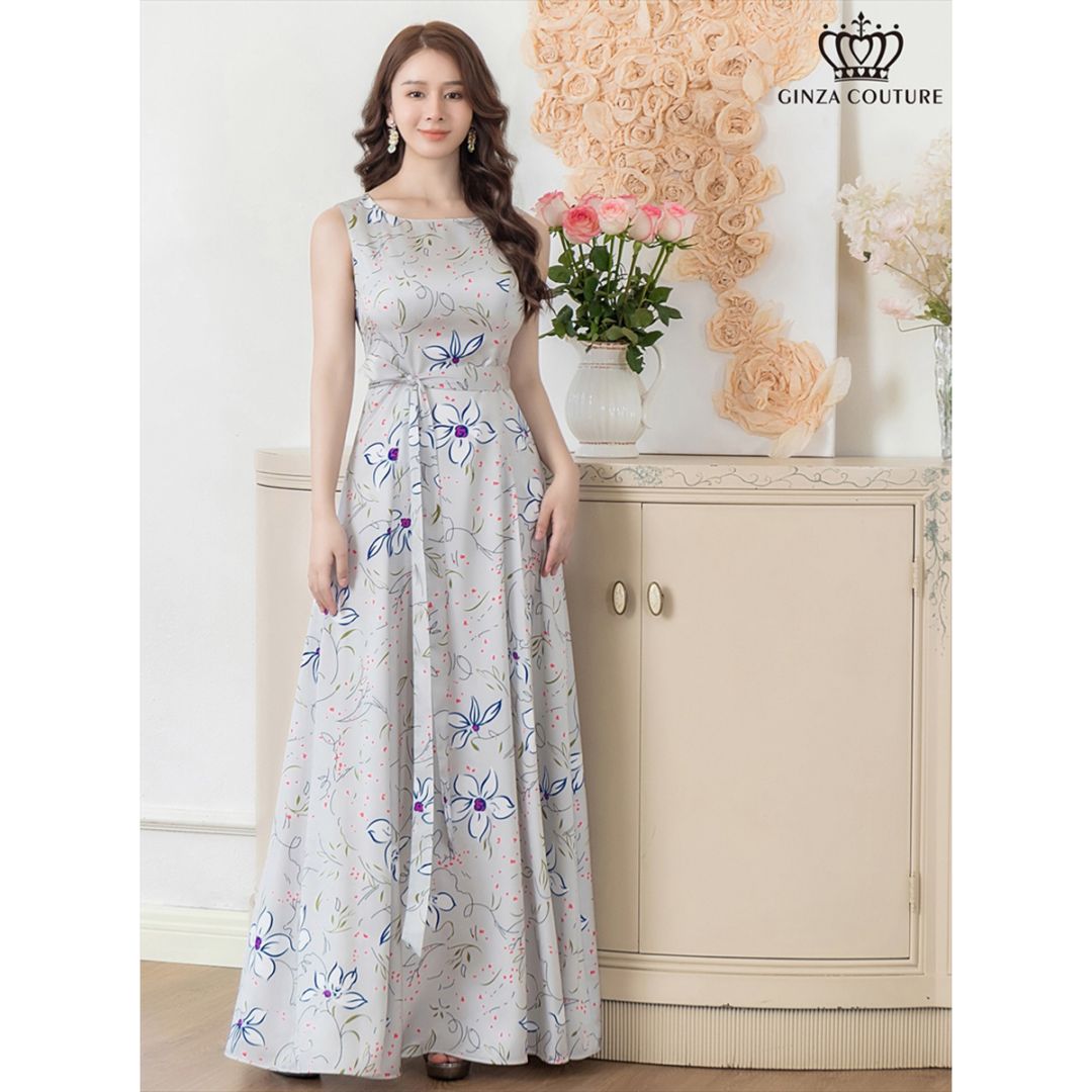 [GINZA COUTURE] 2color フラワープリント Aライン ノースリーブ ウエストリボン ロングドレス グレー ベー...