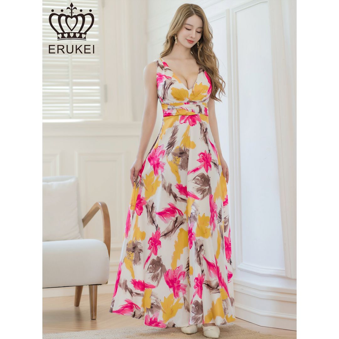 [ERUKEI] スピンドル ノースリーブ フラワープリント Vネック ロングドレス ベージュ×イエロー ホワイト×ブラック エレ...