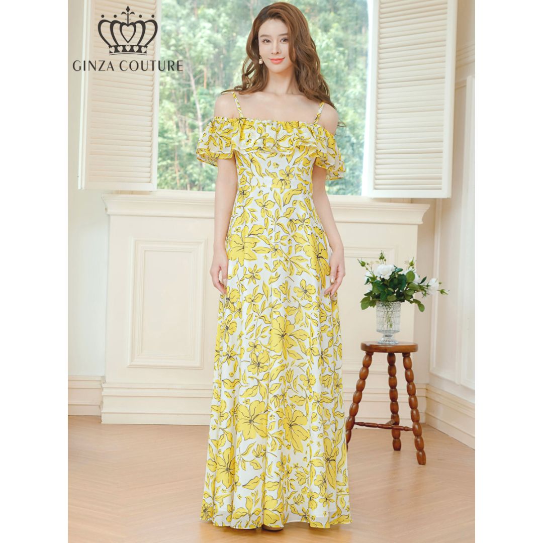 [GINZA COUTURE] 2color シフォン キャミソール オフショルダー 花柄 プリント ロングドレス ワンピース ...