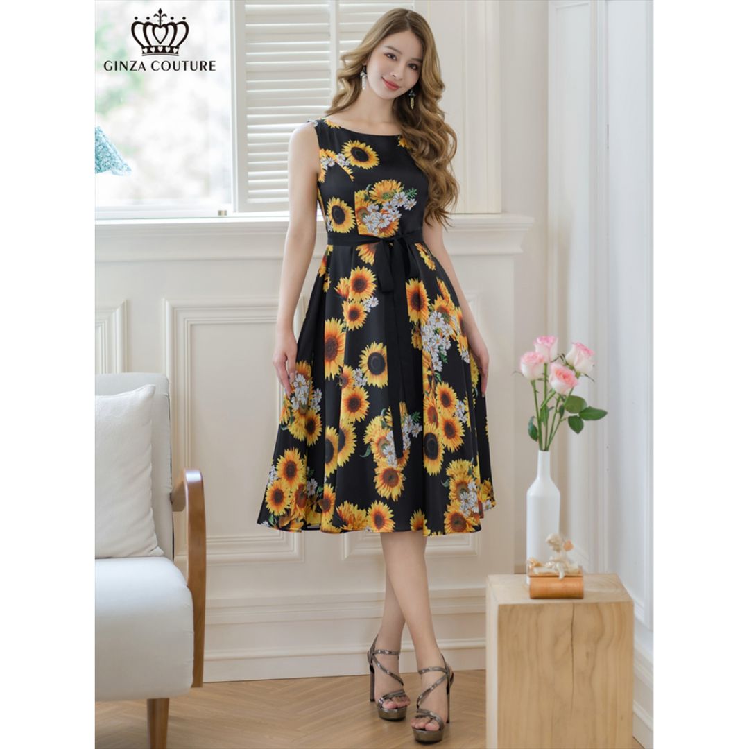 [GINZA COUTURE] プリント 花柄 フラワー ひまわり ノースリーブ Aライン ミディアムドレス ワンピース ブラック...