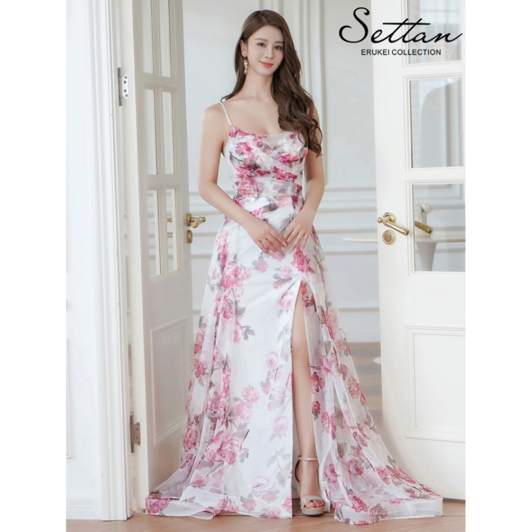 [SETTAN] フラワー 花柄 プリント ラメ 薔薇 バラ ホワイト×ピンク チュールレース キャミソール スリット Aライン...