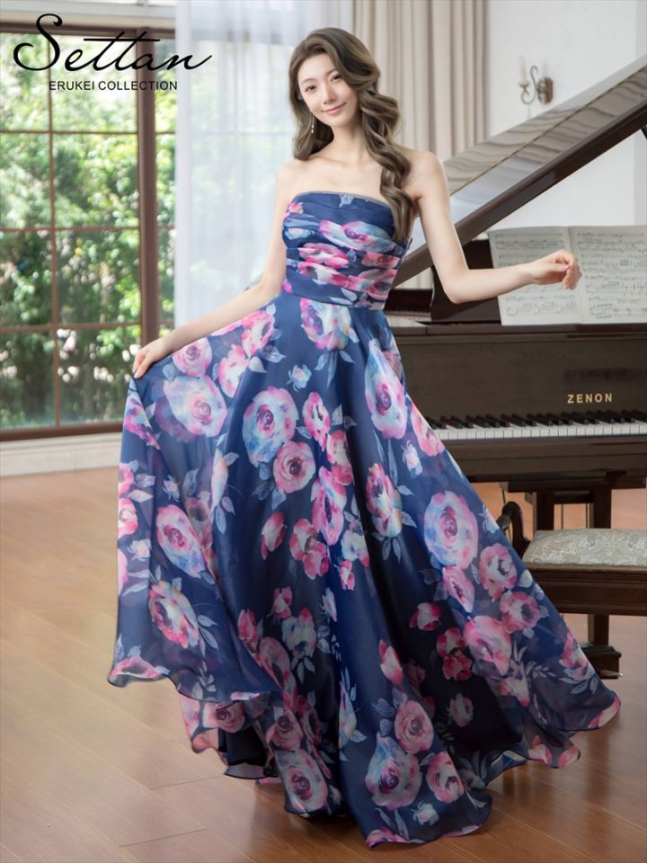 [SETTAN] 2color フラワー プリント ベア Aライン ロングドレス ホワイト×ピンク ネイビー×パープル エレガント...