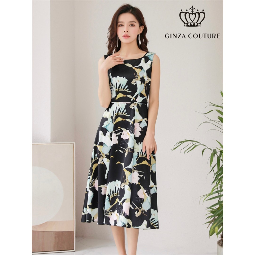 [GINZA COUTURE] ノースリーブ 花柄 フラワープリント Aライン フレア ミディアムドレス ワンピース ブラック ホ...