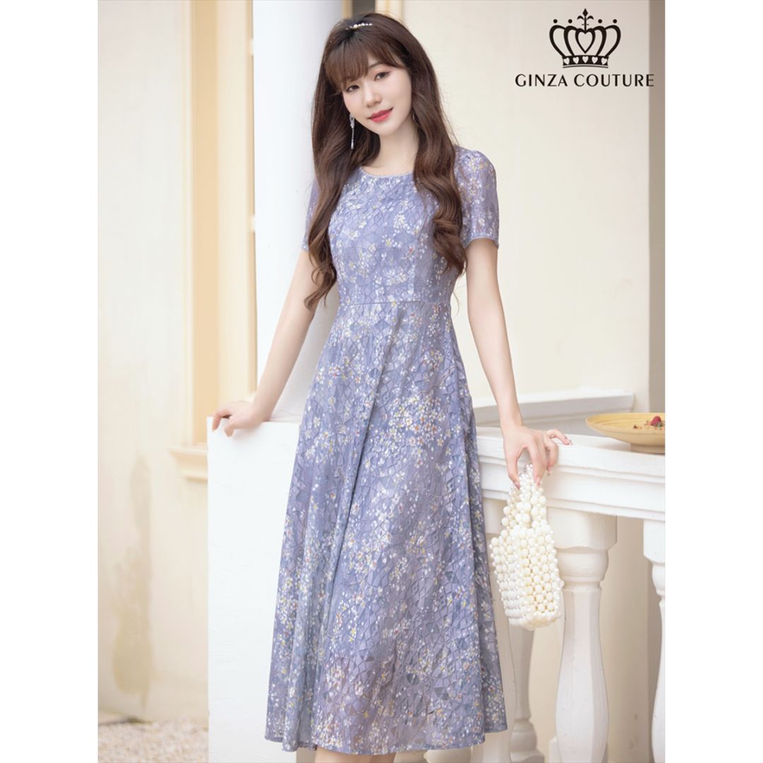 [GINZA COUTURE] 半袖 フラワープリント 総レース Aライン ミディアムドレス ワンピース グレー エレガント モダ...
