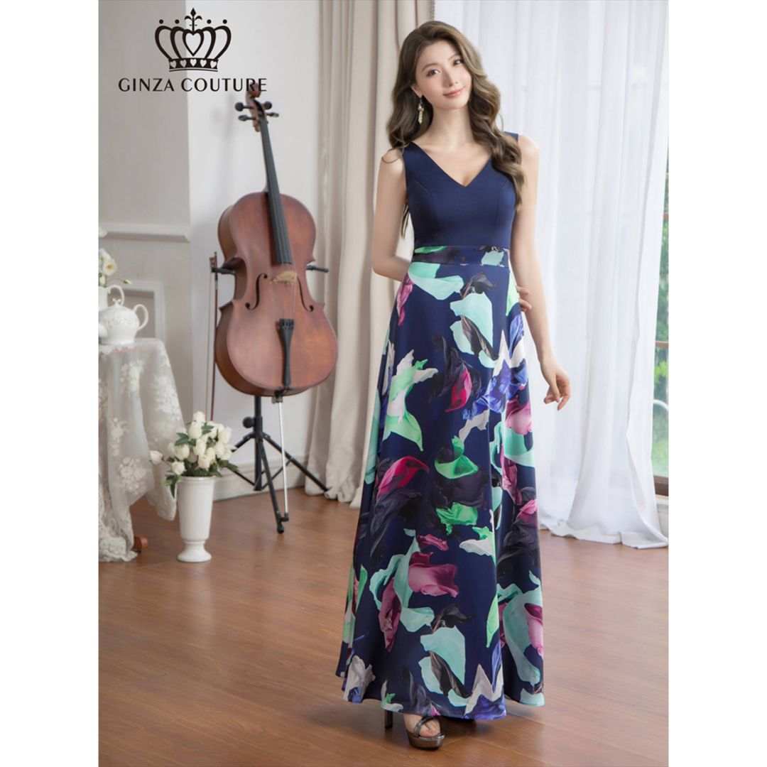 [GINZA COUTURE] フリルポイント Vネック 花柄 プリント 切り替え ノースリーブ Aライン ハイウエスト ロングド...