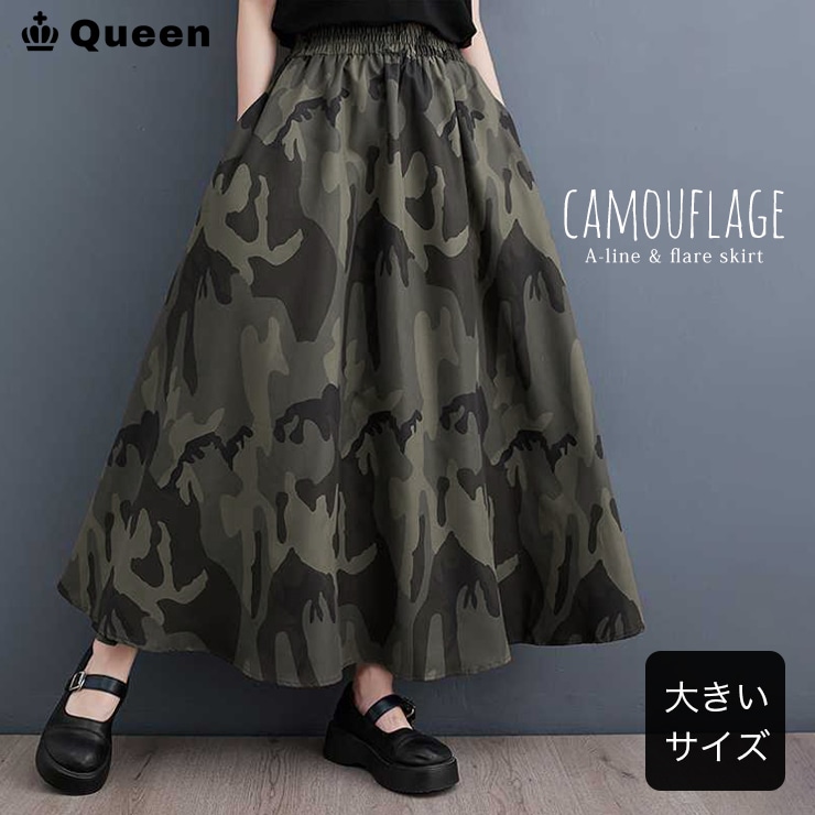 大きいサイズ レディース スカート 迷彩 フレアスカート ウエストゴム Aライン ロング丈 春 夏 秋 (518016)