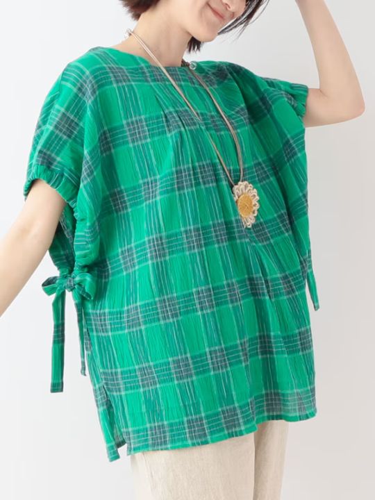 【50%OFF】グリーン1点限り/シャーリングチェックコットン ブラウス
