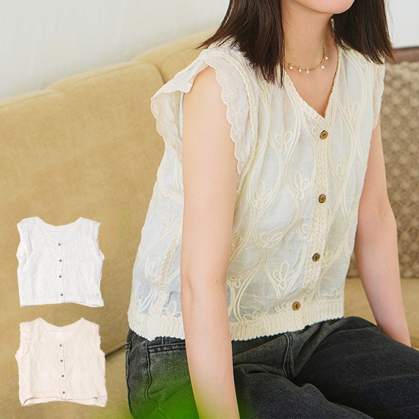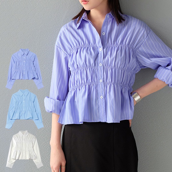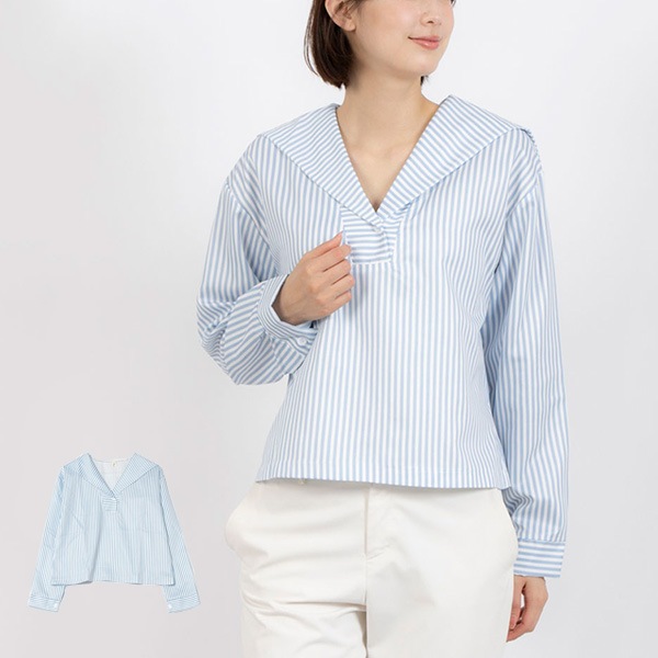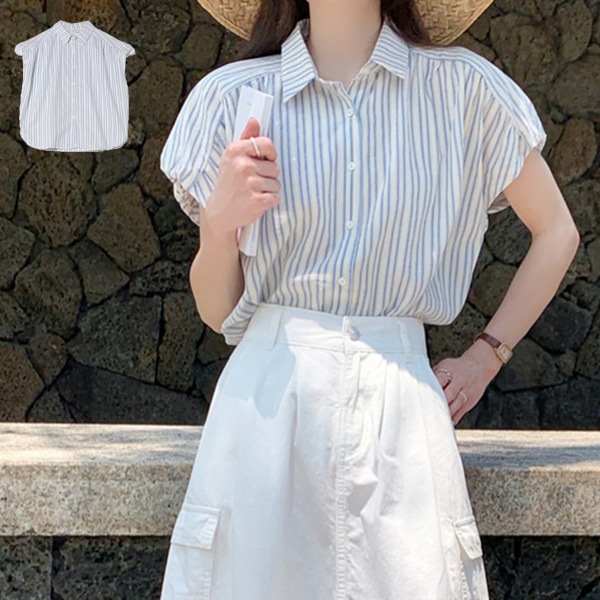 リネンタッチ先染めストライプノースリーブギャザーブラウス