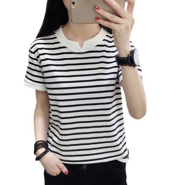 レディース ボーダー コットン Tシャツ 半袖 トップス カットソー 爽やか キーネック 伸縮性 シンプル シック きれいめ お洒...