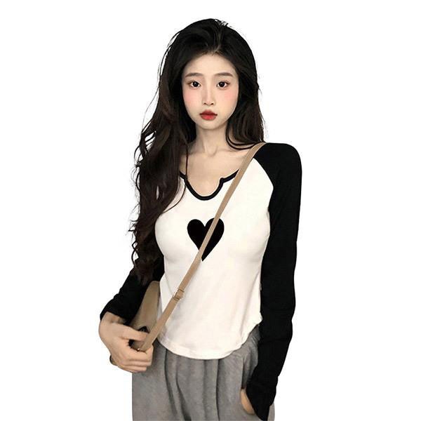 レディース ラグランスリーブ Tシャツ 長袖 カットソー キーネック フロント ハートプリント コットン 柔らかい カジュアル 着...