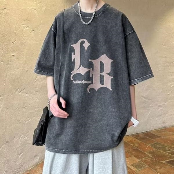 メンズ プリント ウォッシュド 五分袖 Tシャツ 半袖 トップス プルオーバー 大きいサイズ ゆったり リラックス ルーズ カジュ...