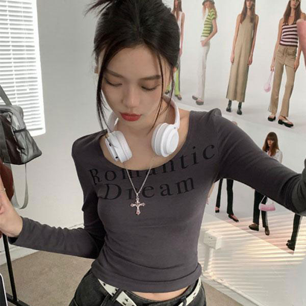 レディース Uネック 英字 プリント 長袖 Tシャツ カットソー ロンT トップス インナー タイト シルエット カジュアル 着や...