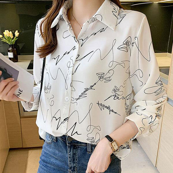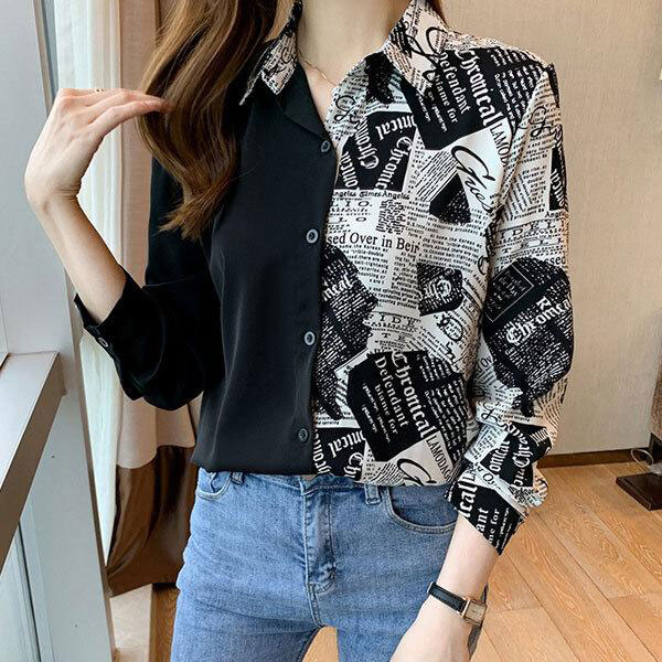 レディース 総柄 長袖シャツ 2カラー 4サイズ ポリエステル素材 柔らかな肌触り レトロ雰囲気あり ユニーク柄 モノトーン ボト...