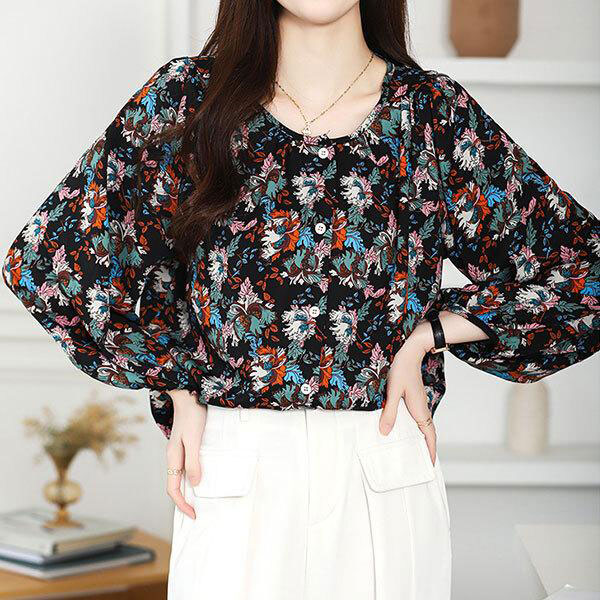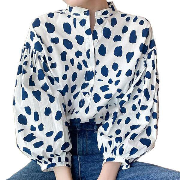 レディース シャツブラウス ワンカラー 5サイズ 鮮やか 花びら模様 特徴的 7分丈 パフスリーブ 緩やかな スタンドカラー ボタ...
