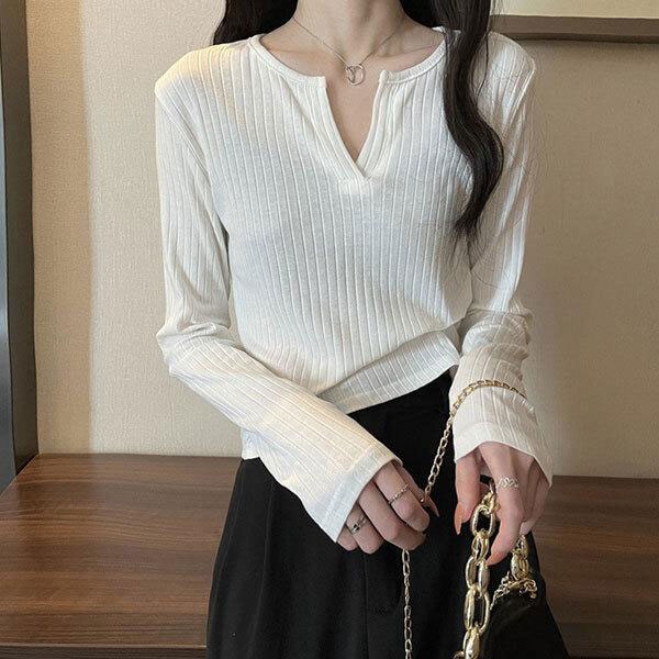 レディース Vネック リブ カットソー プルオーバー 長袖 トップス キーネック ルームウェア 部屋着 カジュアル お出掛け 上品...