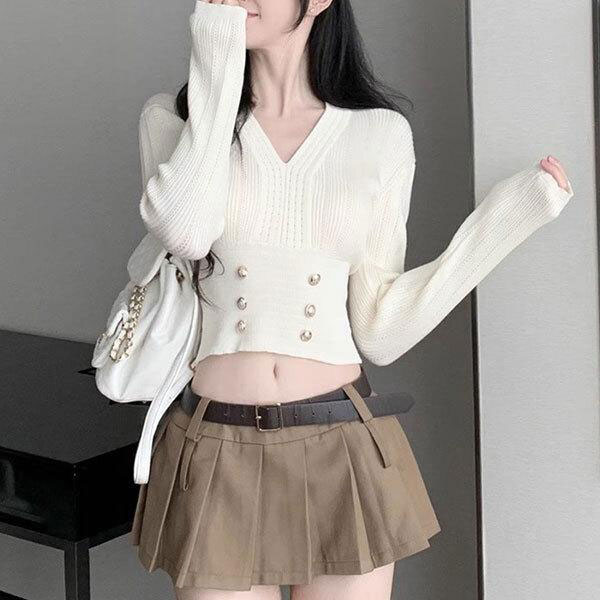 レディース Vネック ミニ丈 ニット ワンサイズ 3カラー 柔らか雰囲気 へそ出しルック ボタンアクセント タイト トップス きれ...