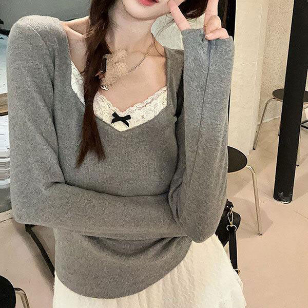 レディース Vネック 首元ゆったり 長袖 ニットセーター ワンサイズ 2カラー 柔らか雰囲気 レース調 襟元 リボン アクセント ...