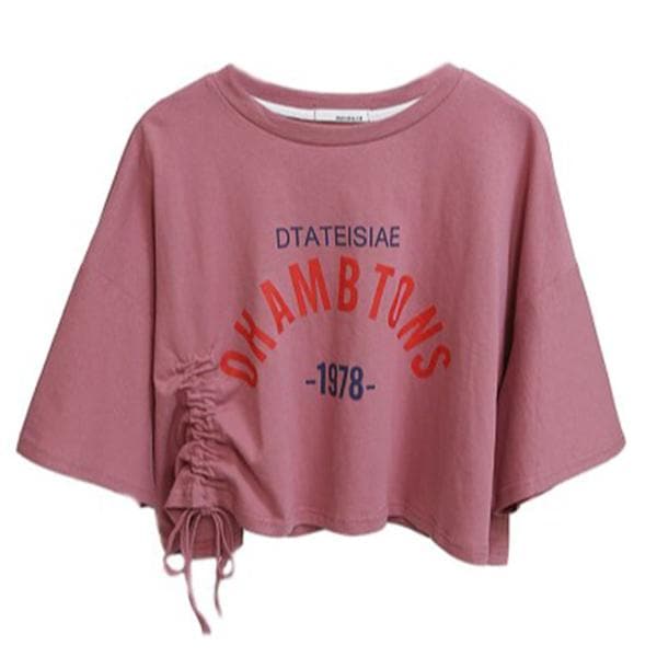 レディース クロップド丈 Tシャツ 半袖 トップス サイドストリング ギャザー ビンテージ風 プリント 大きいサイズ ゆったり レ...