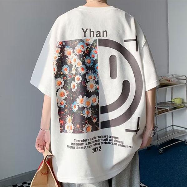 メンズ 半袖 Tシャツ バックプリント スマイル お花畑 ゆったりサイズ リラックス感 カジュアル おしゃれ かっこいい