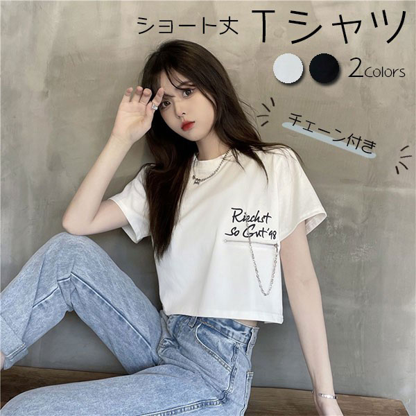 Tシャツ レディース 半袖 夏シャツ 英字プリント ジッパー チェーン 韓国風 通気性 さらさら 涼しい ショート丈