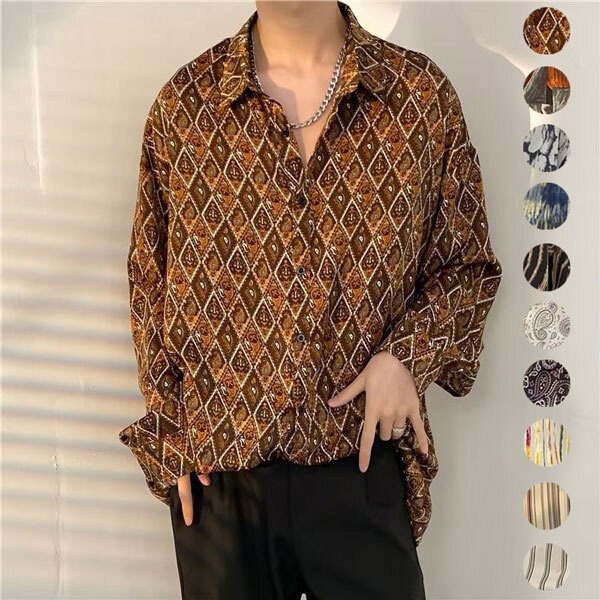 【セール】即納 安い メンズ ドレスシャツ 長袖 シャツ 総柄 オーバーサイズ ゆったり ルーズ ビッグシルエット モード系 レト...