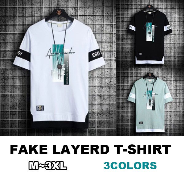 【セール】即納 安い メンズ Tシャツ フェイクレイヤード グラフィックプリント 半袖 トップス シャツ 重ね着風 クルーネック ...