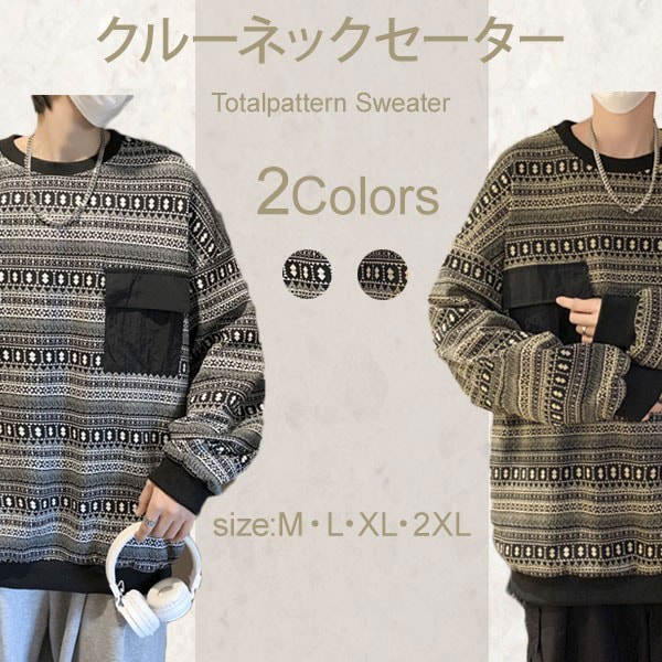 【セール】即納 安い メンズ クルーネック セーター ニット 胸元 ポケット付 ペイズリー柄 総柄 オーバーサイズ ルーズ シック...
