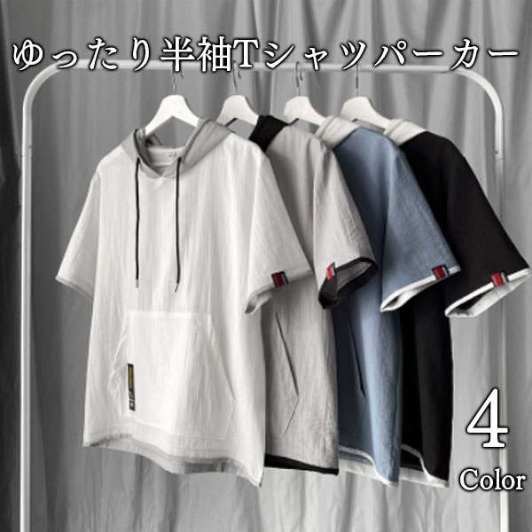【セール】即納 安い メンズ Tシャツパーカー 半袖 フード付き トップス Tシャツ プルオーバー ゆったり レイヤード 重ね着風...