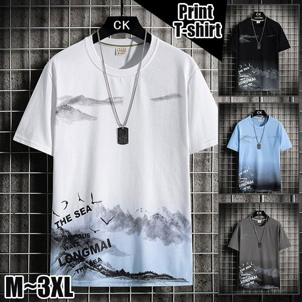 【即納】メンズ トップス Tシャツ 半袖 プリント グラデージョン 墨絵風 クルーネック カットソー カジュアル 大きいサイズ 和...