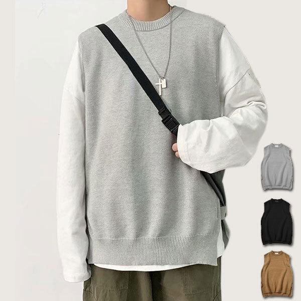 【セール】即納 安い メンズ ベスト クルーネック サイドにスリット ゆったり オーバーサイズ 体型カバー トップス ベーシックカ...