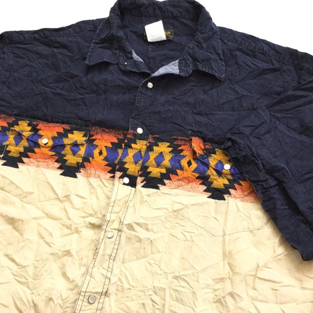RUSTLER Wrangler 半袖ウエスタンシャツ カウボーイ アメリカ古着 メンズ 3X/紺x茶系 ネイティヴ エスニック ...