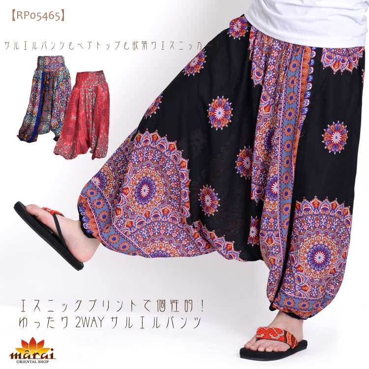 エスニックプリントで個性的!ゆったりサルエルパンツ